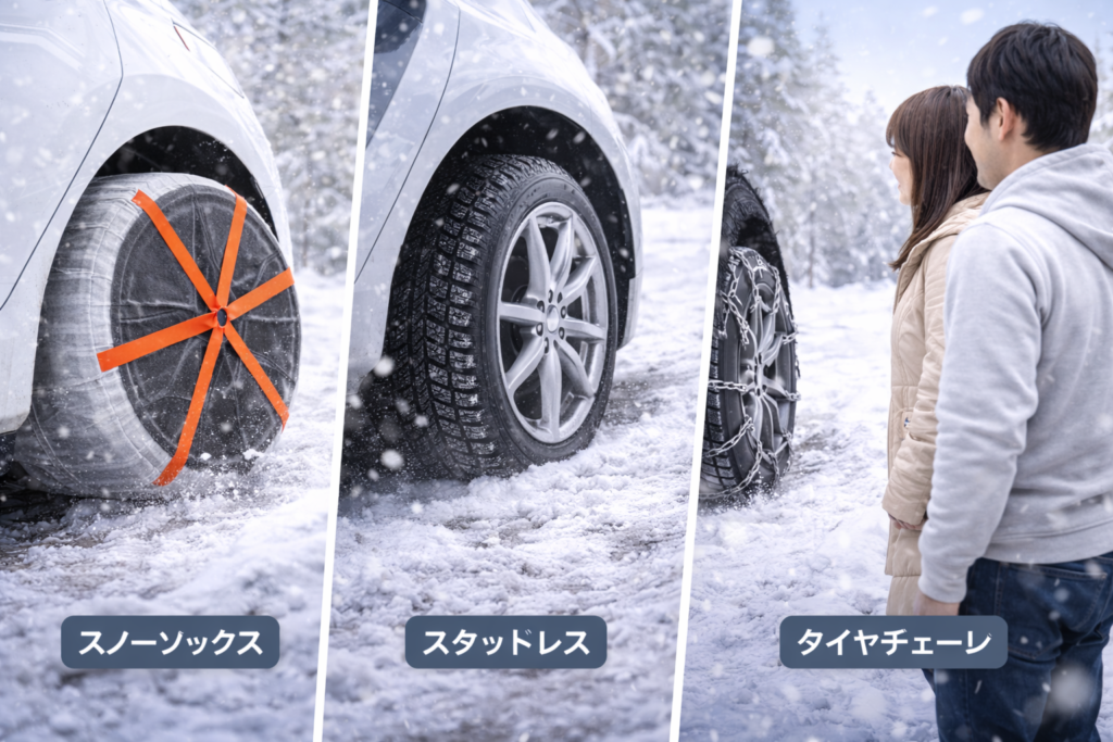 金属チェーンやスタッドレスタイヤと比べる